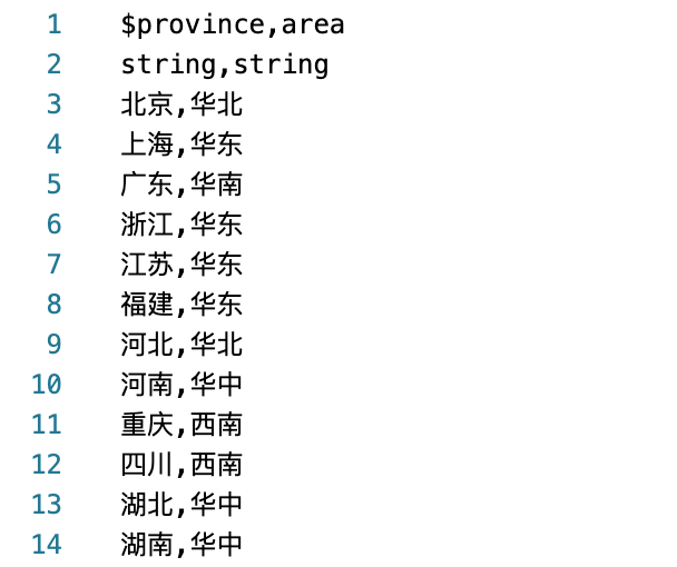 对于维度表本身而言，关联字段还有一个作用，就是用来标识每条记录的唯一性。也就是说，维度表中关联字段的值（也称key值），就是每条记录的唯一ID。示例中 area 维度表中每行数据的 $province 的值（北京、上海等）都是唯一的、不重复的。