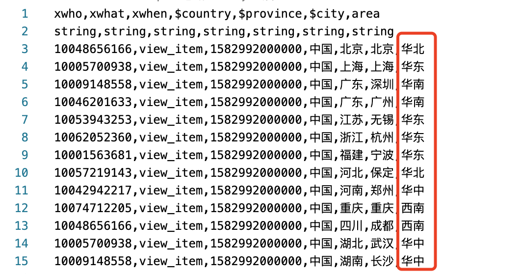 举例来说，当事件表中一个事件的 $province字段值=“北京”时，就可以通过两张表的关联得到该事件的 area = “华北”，以此类推，最终我们为每条事件都扩展了一个新的属性：“area”，如下图所示。