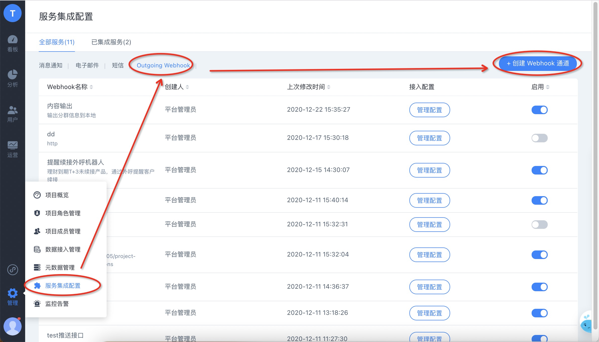 4. 支持创建Webhook推送,将分群数据快速对接到外呼系统、券系统等内部系统
